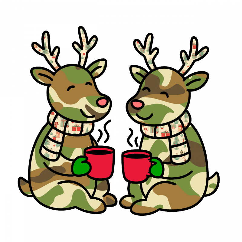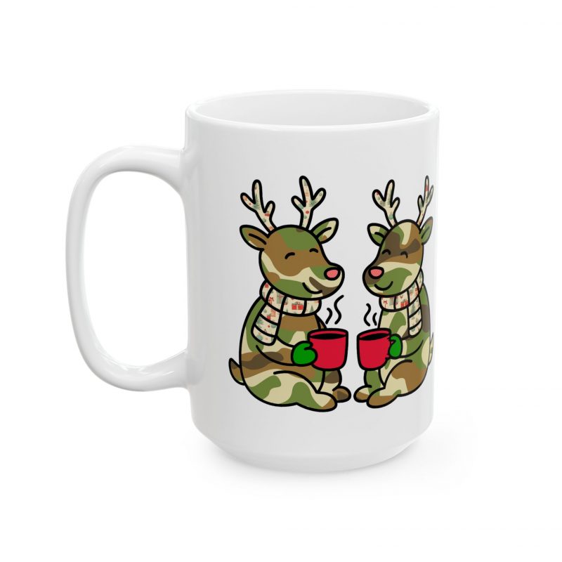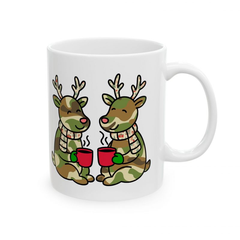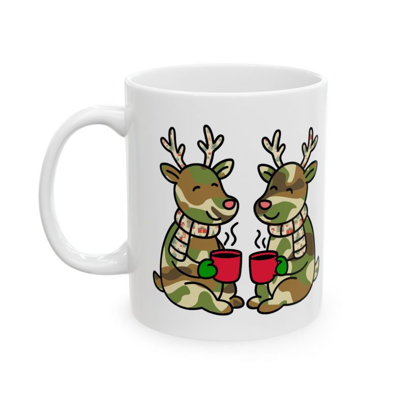 Adorable ceramic mug featuring two cute camo colored reindeer enjoying coffee outside. Perfect for adding a touch of whimsy to your morning routine or as a gift for the holiday season. Ideal for coffee lovers and animal enthusiasts.