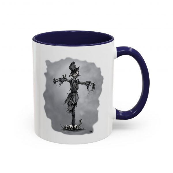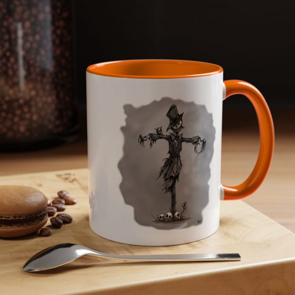 This Halloween-themed mug features an original and frightening scarecrow design, perfect for adding a spooky touch to your coffee time. It is ideal for Halloween decor enthusiasts and horror movie lovers. This mug can be a great addition to your collection for Halloween parties, horror movie marathons, or simply to enjoy your morning coffee with a twist. Our color accent mug brings the perfect blend of style and functionality to elevate your coffee or tea ritual. Available in two generous sizes, 11oz (0.33 l) and 15oz (0.44 l), this mug offers ample space for your favorite brew. Made with white ceramic and sporting a sleek glossy finish with eye-catching contrast, this mug is a bliss both to use and to look at. The ergonomic C-shaped handle provides a comfortable grip, while the lead and BPA-free construction guarantee peace of mind with every sip.