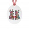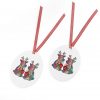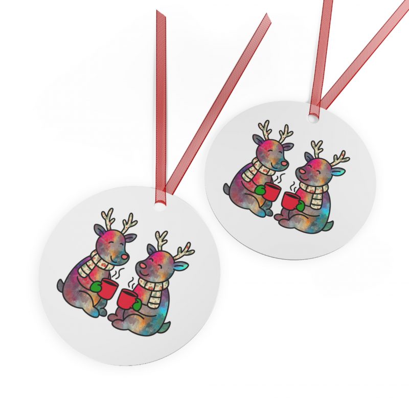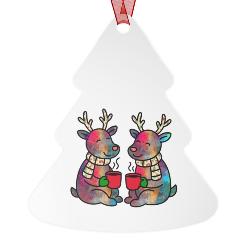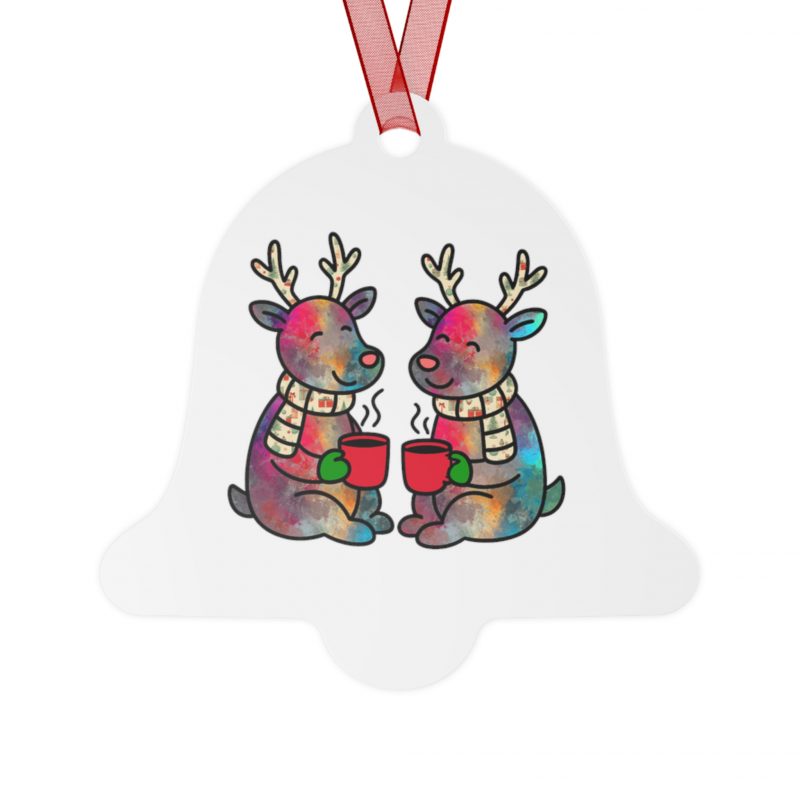 A glossy white metal ornament shaped like a bell, tree, round or oval, printed on both sides with a bright, colorful design. This lightweight aluminum piece brings a playful, hand-drawn reindeer design to your holiday decor — two cozy reindeer sharing steaming mugs, wrapped in scarves. The durable, scratch- and chip-resistant finish keeps the image vibrant year after year, and each ornament arrives ready to hang with a red ribbon threaded through a pre-drilled hole. It’s a small, joyful accent that slips easily into an existing collection or becomes a sweet, personal addition to a tree or mantel display.