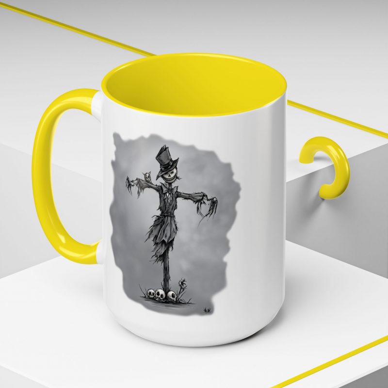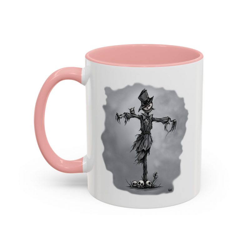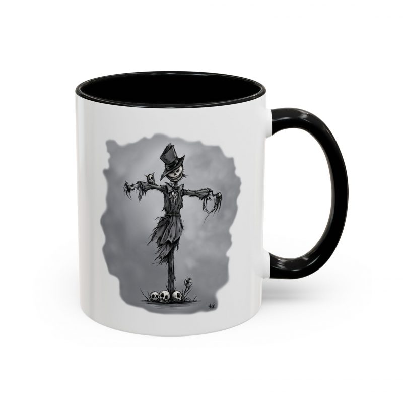 This Halloween-themed mug features an original and frightening scarecrow design, perfect for adding a spooky touch to your coffee time. It is ideal for Halloween decor enthusiasts and horror movie lovers. This mug can be a great addition to your collection for Halloween parties, horror movie marathons, or simply to enjoy your morning coffee with a twist. Our color accent mug brings the perfect blend of style and functionality to elevate your coffee or tea ritual. Available in two generous sizes, 11oz (0.33 l) and 15oz (0.44 l), this mug offers ample space for your favorite brew. Made with white ceramic and sporting a sleek glossy finish with eye-catching contrast, this mug is a bliss both to use and to look at. The ergonomic C-shaped handle provides a comfortable grip, while the lead and BPA-free construction guarantee peace of mind with every sip.