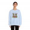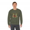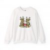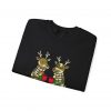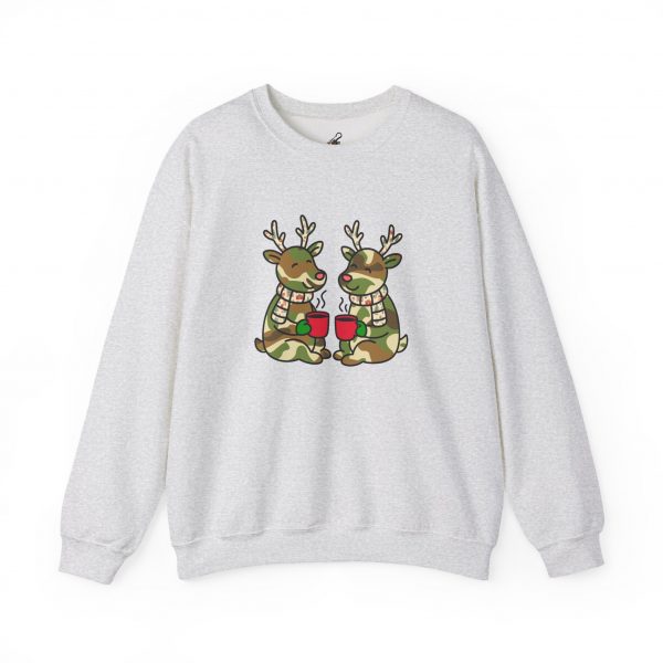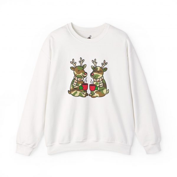 A cozy unisex crewneck sweatshirt featuring a holiday design of two camouflage colored reindeer enjoying hot cocoa outside. Perfect for those who love festive and cozy apparel, this sweatshirt is ideal for winter holidays and Christmas celebrations.