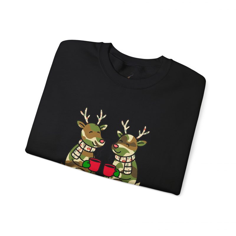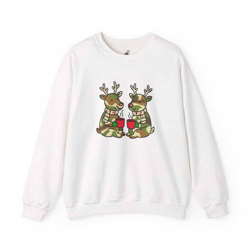 A cozy unisex crewneck sweatshirt featuring a holiday design of two camouflage colored reindeer enjoying hot cocoa outside. Perfect for those who love festive and cozy apparel, this sweatshirt is ideal for winter holidays and Christmas celebrations.
