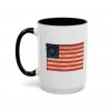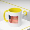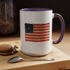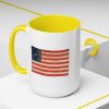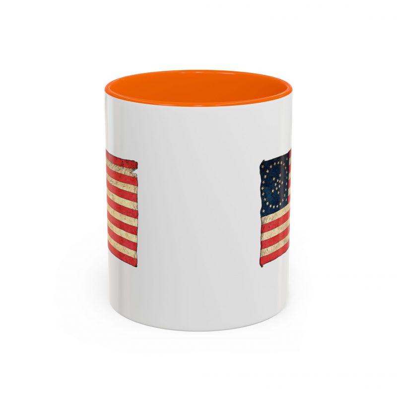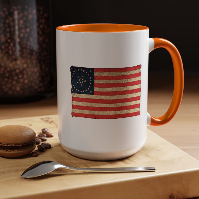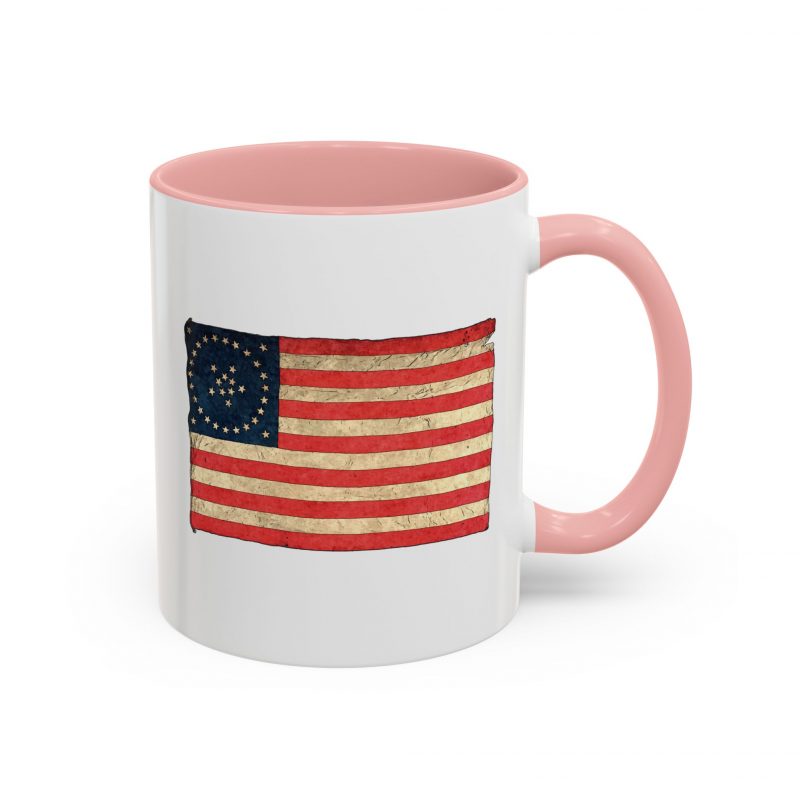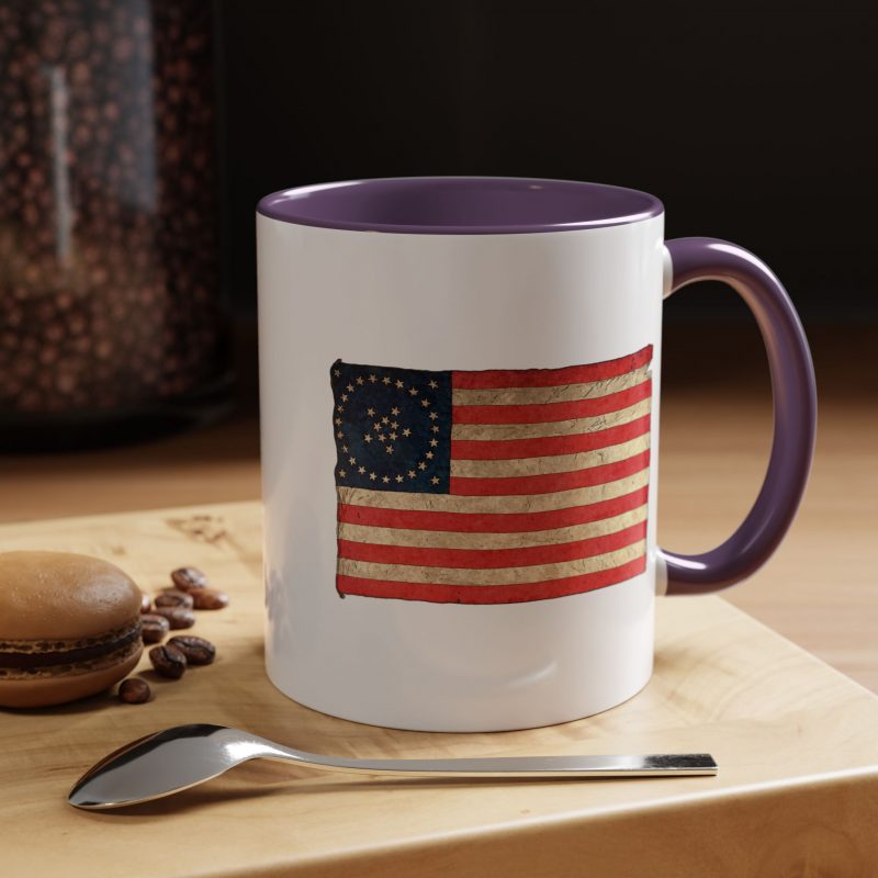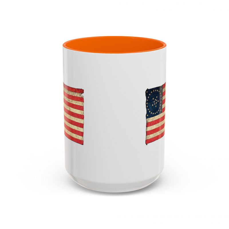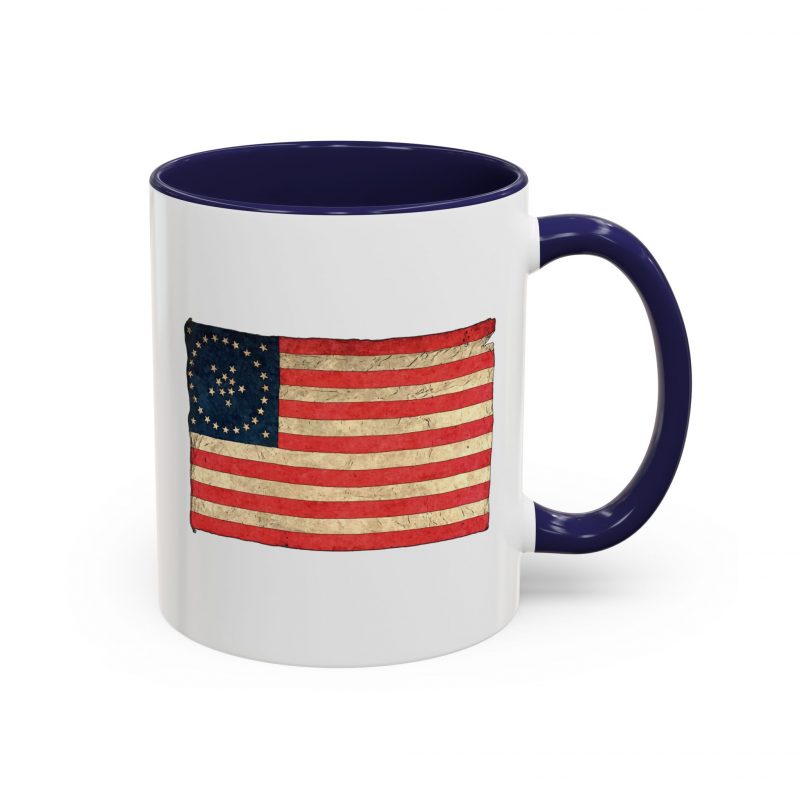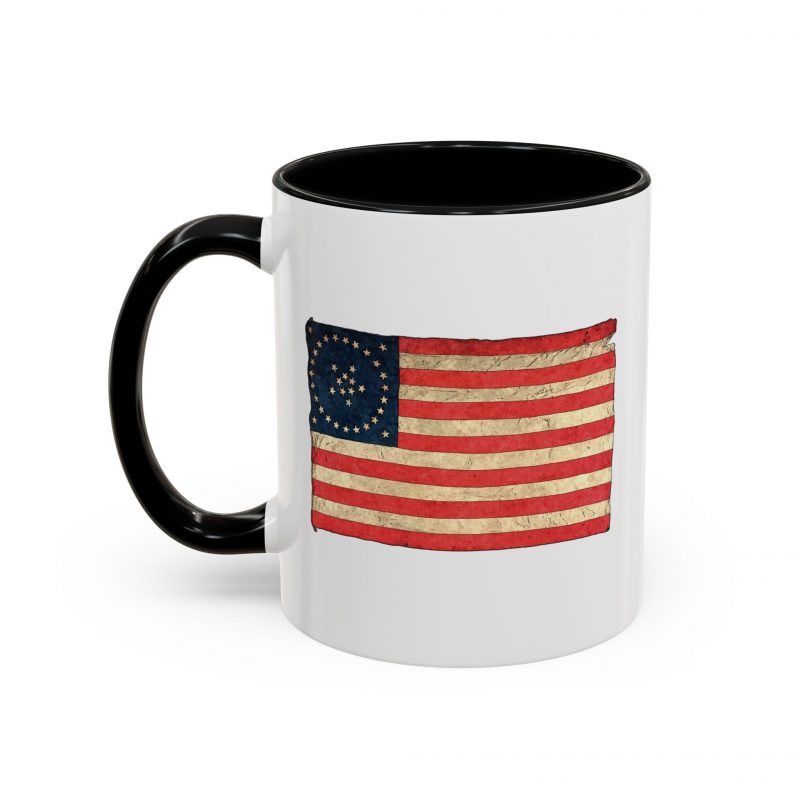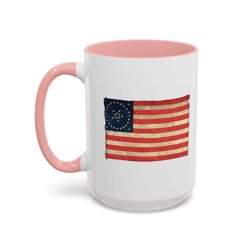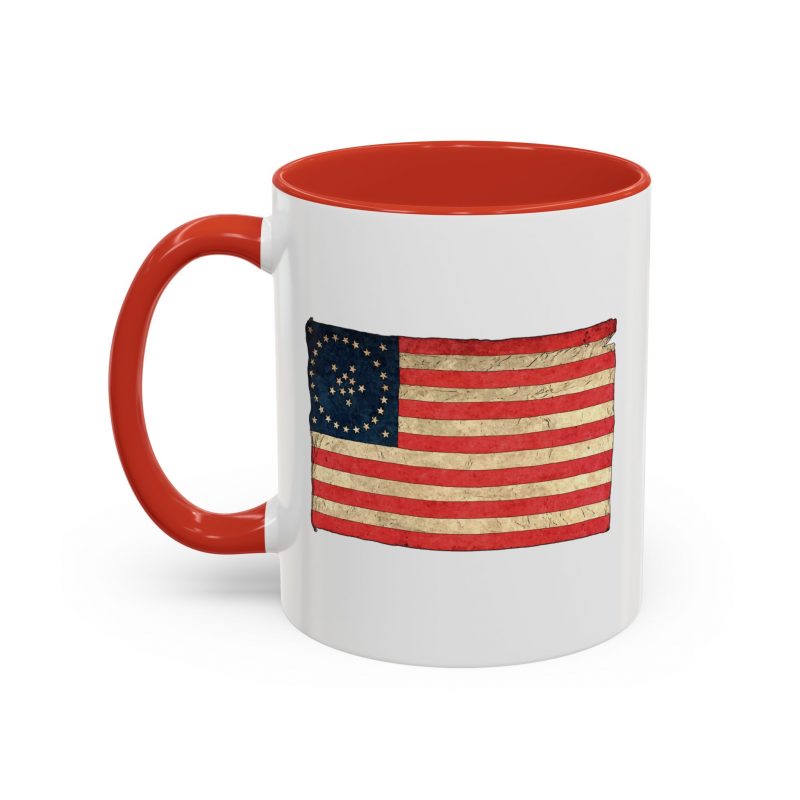 A worn, Medallion Grand Luminary flag drifts across the side of a glossy ceramic mug, its faded reds and muted blues suggesting afternoons on a porch or quiet moments before the day begins. This patriotuc mug fits into daily routines — cradling a morning coffee or holding an evening tea — while quietly honoring a nostalgic, Americana spirit. The colored interior and handle add a subtle pop that complements the distressed flag artwork, giving the piece character without shouting for attention. For someone who loves history, road trips, or small domestic rituals, this mug feels familiar and thoughtfully made: sturdy enough for everyday use, yet thoughtful in its aesthetic details.