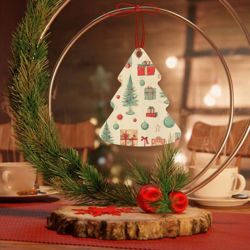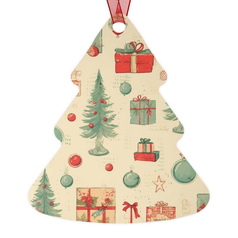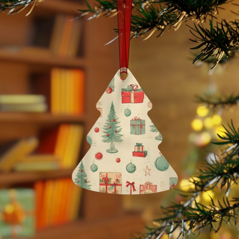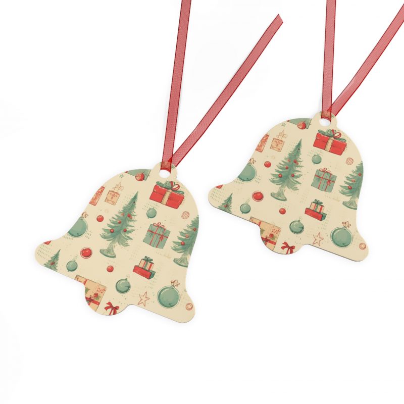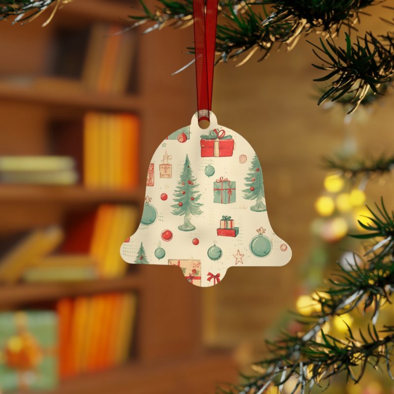 A small, glossy metal ornament that brings a soft vintage holiday charm to your home. Lightweight but sturdy, each ornament is printed on both sides with crisp, colorful artwork and finished on a white aluminum base so the design reads clearly from every angle. A pre-drilled hole and red ribbon make hanging effortless — whether it’s tucked into the branches of a densely decorated tree, added to a minimalist sprig, or tied onto a gift. The bell-shaped silhouette shown carries nostalgic illustrations of trees, wrapped presents, and baubles in muted greens and reds, creating a cozy, storybook feel that fits seasonal décor or memory-filled collections.