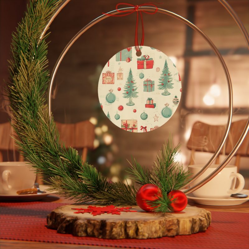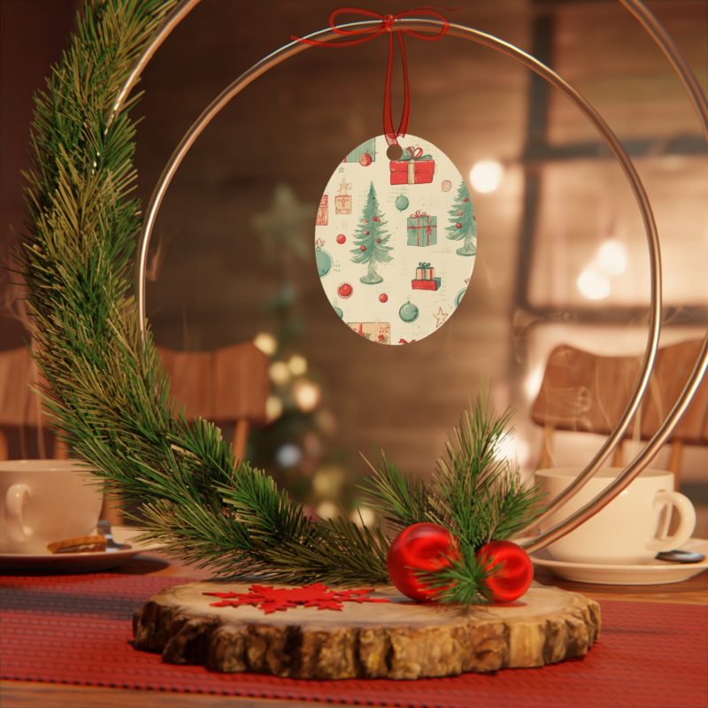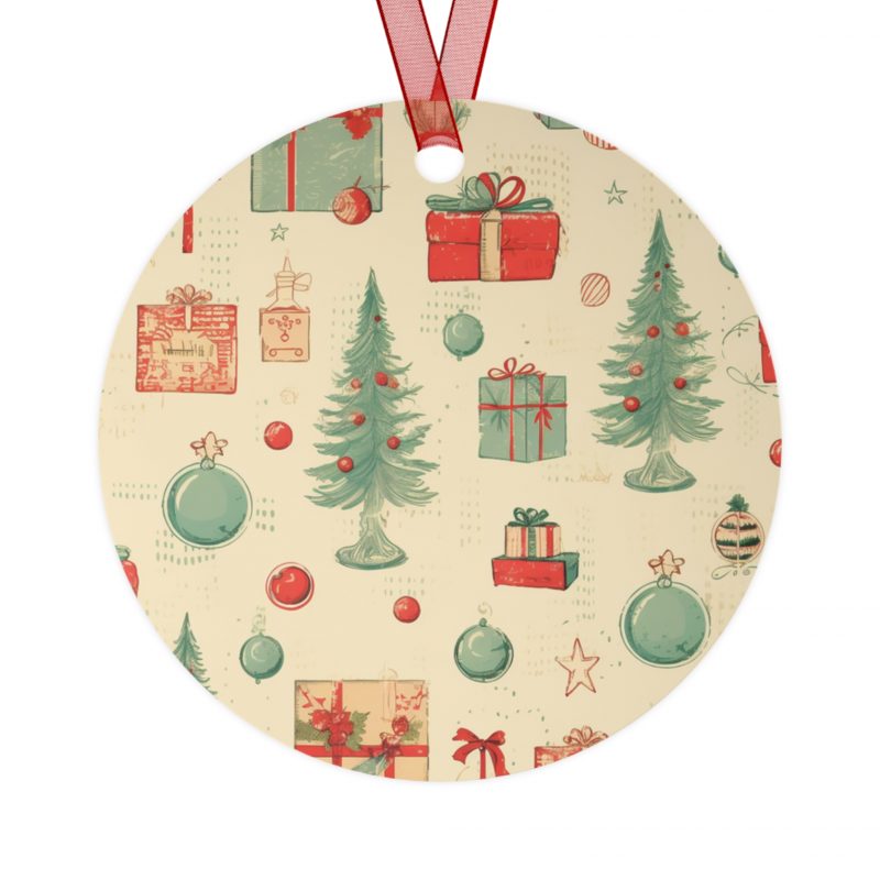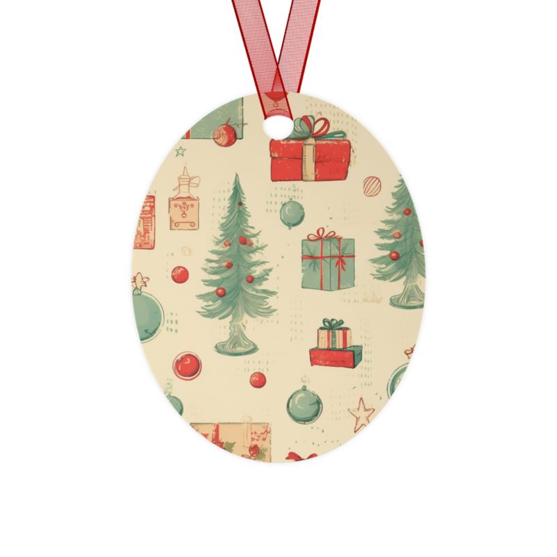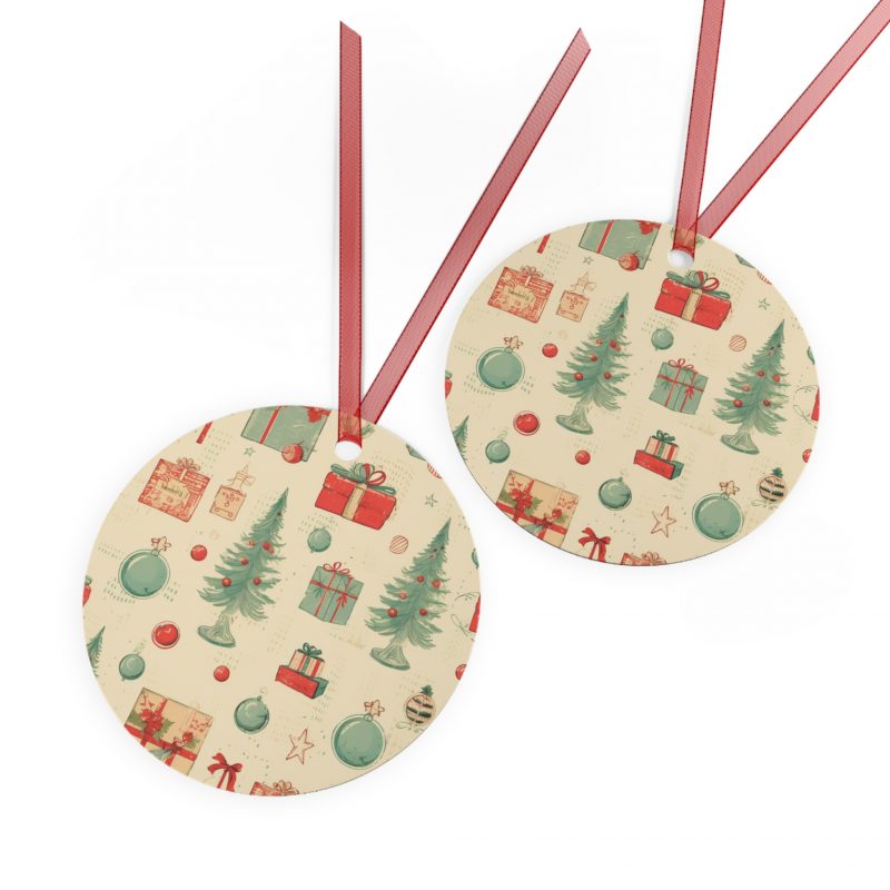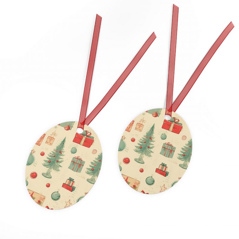 A small, glossy metal ornament that brings a soft vintage holiday charm to your home. Lightweight but sturdy, each ornament is printed on both sides with crisp, colorful artwork and finished on a white aluminum base so the design reads clearly from every angle. A pre-drilled hole and red ribbon make hanging effortless — whether it’s tucked into the branches of a densely decorated tree, added to a minimalist sprig, or tied onto a gift. The bell-shaped silhouette shown carries nostalgic illustrations of trees, wrapped presents, and baubles in muted greens and reds, creating a cozy, storybook feel that fits seasonal décor or memory-filled collections.